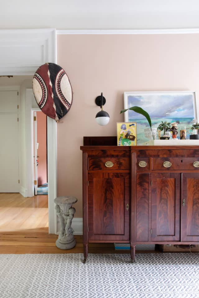 Nice late 19th c. console. Has held dining room stuff (linens, napkins, occasion pieces) and arts/crafts materials. The Masai shield needs a home; it was my father’s. (The Annie Selke metallic-weave rug LINK was one of my favorites. Feels great underfoot!)