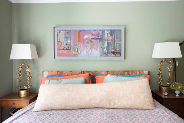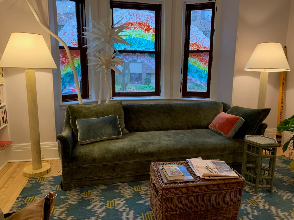 Montauk sofa; pair of Karl Springer-style horn standing lamps; enormous wicker hinged basket; vintage bamboo hexagon cocktail table (paint matte black with lacquer black top?!); giant pencil.