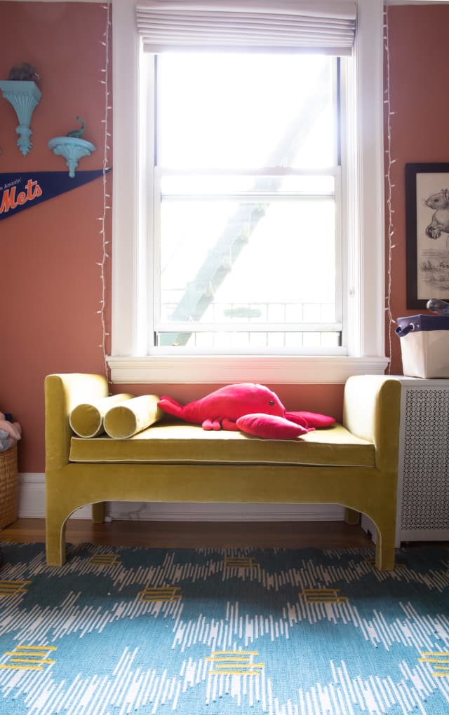 Ballard Designs bench in honeydew melon velvet. Custom Rug, turqoise + lemon (Studio Four by Carrier & Co)