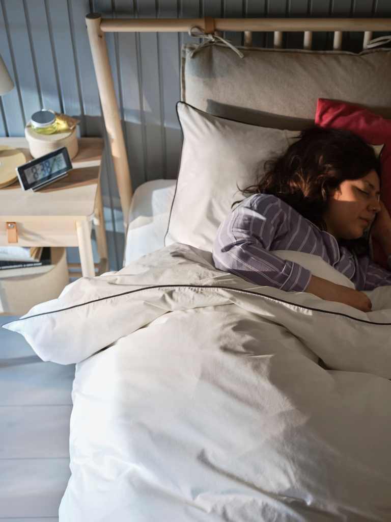 Ikea king bed. The cute tie-on linen cushions can be re-made with our own fabric (not critical, just a sweet idea.)