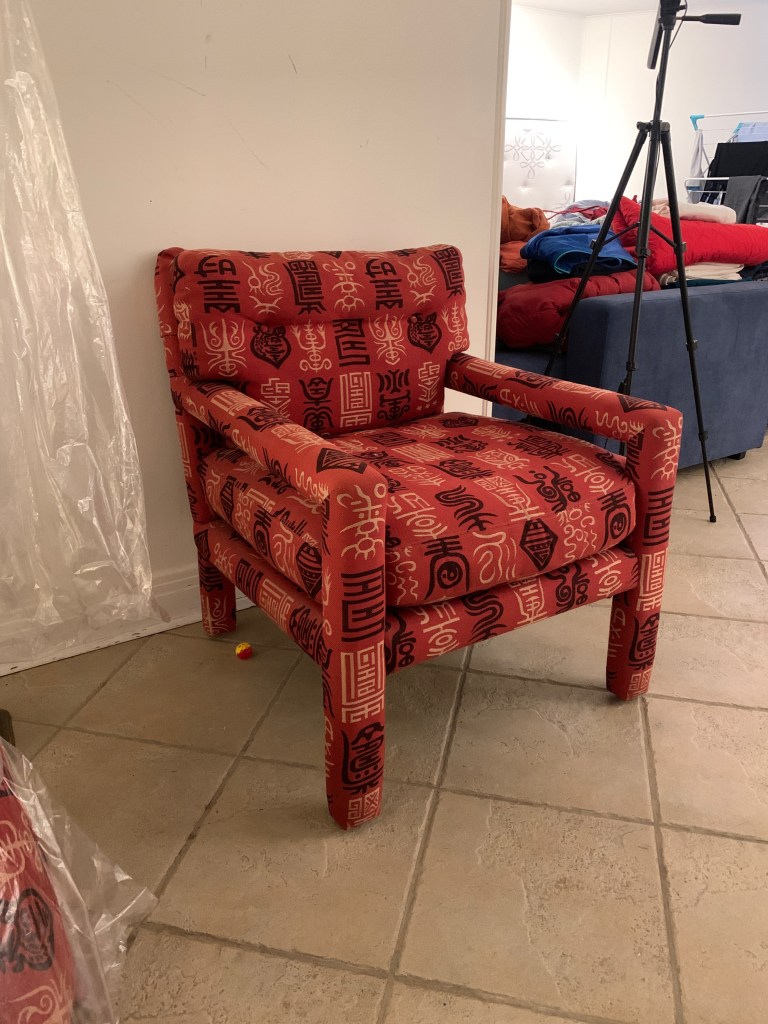 Custom Tuxedo-style queen-sleeper sofa in KravetSmart red fabric. Could used a steam clean. Bench seat and two back cushions. Very comf! Two Rejuvenation rugs (7×10 each); vintage Scandinavian sling chair; Eames lounge; Visual Comfort cantilevered reading lamp; enormous plaster and canvas palm tree; champagne cork stool
