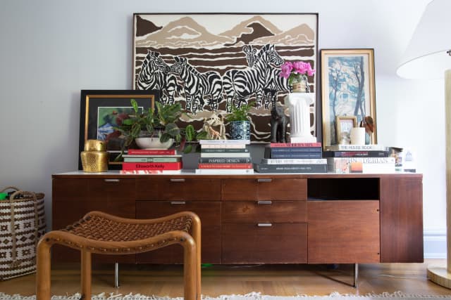 Midecentury console (was Greg’s desk console. Can we give it back to him?); custom bent-wood and rawhide bench (an objet, not actually comfortable); some art, including 1970s silk screen of zebras.