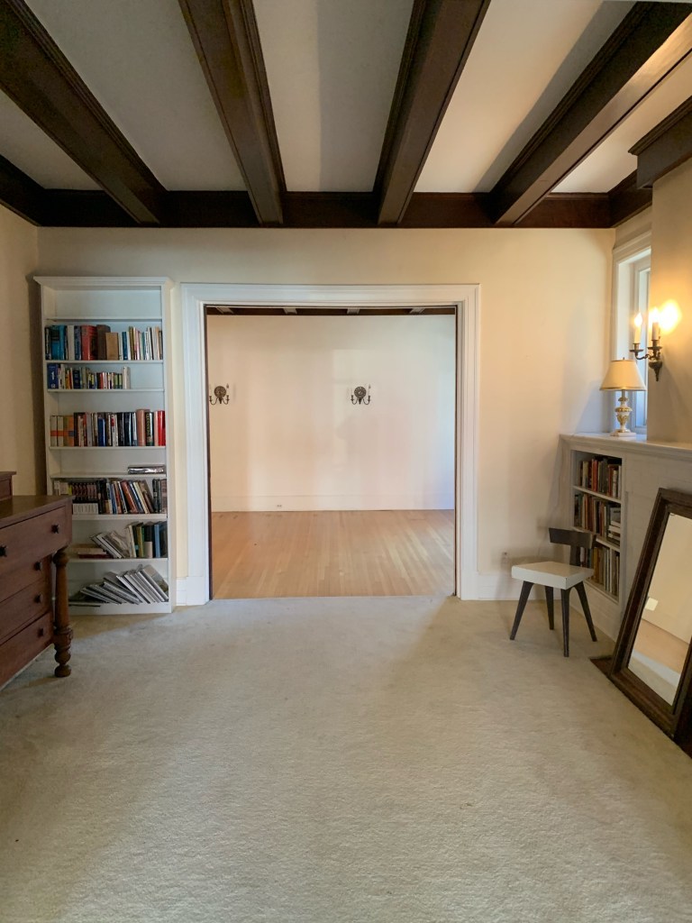 - ^ Looking from living room into the study. 2. The study with fireplace 3. from study looking back at living room. Carpet stripped, wood beams stained lighter/matte or painted.