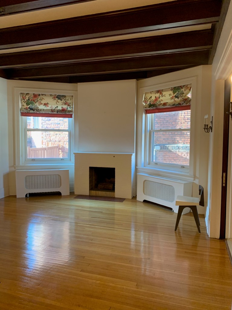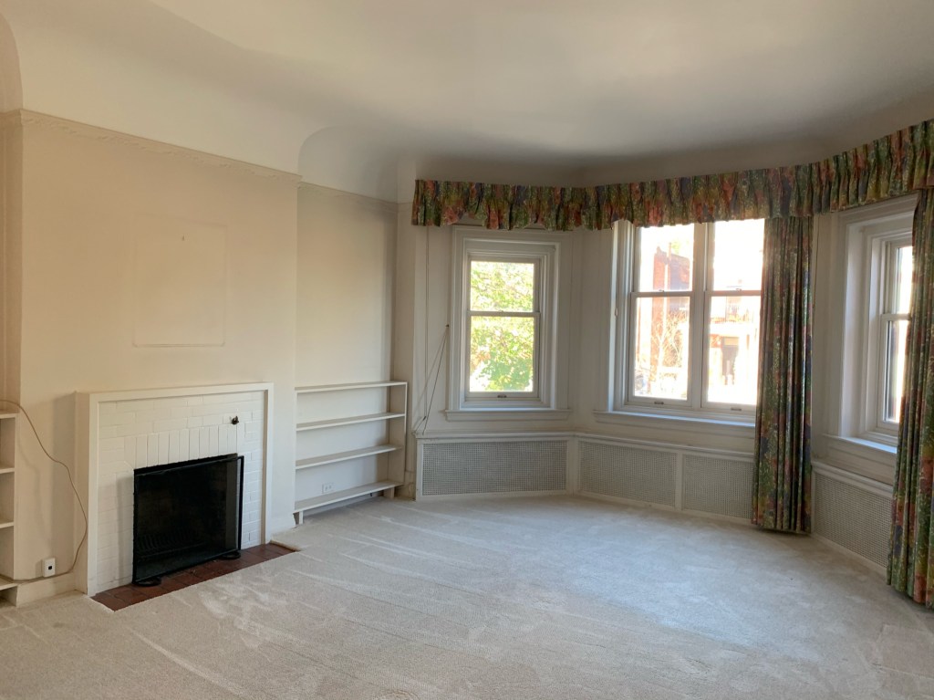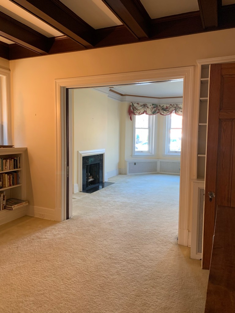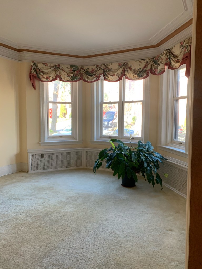 ^ Original living room moldings offer an amazing chance to use 3 colors to intensify the details. Will paint window moldings, and walls too. Carpet removed to reveal original wood floors. Curtains are…. gone ๐
