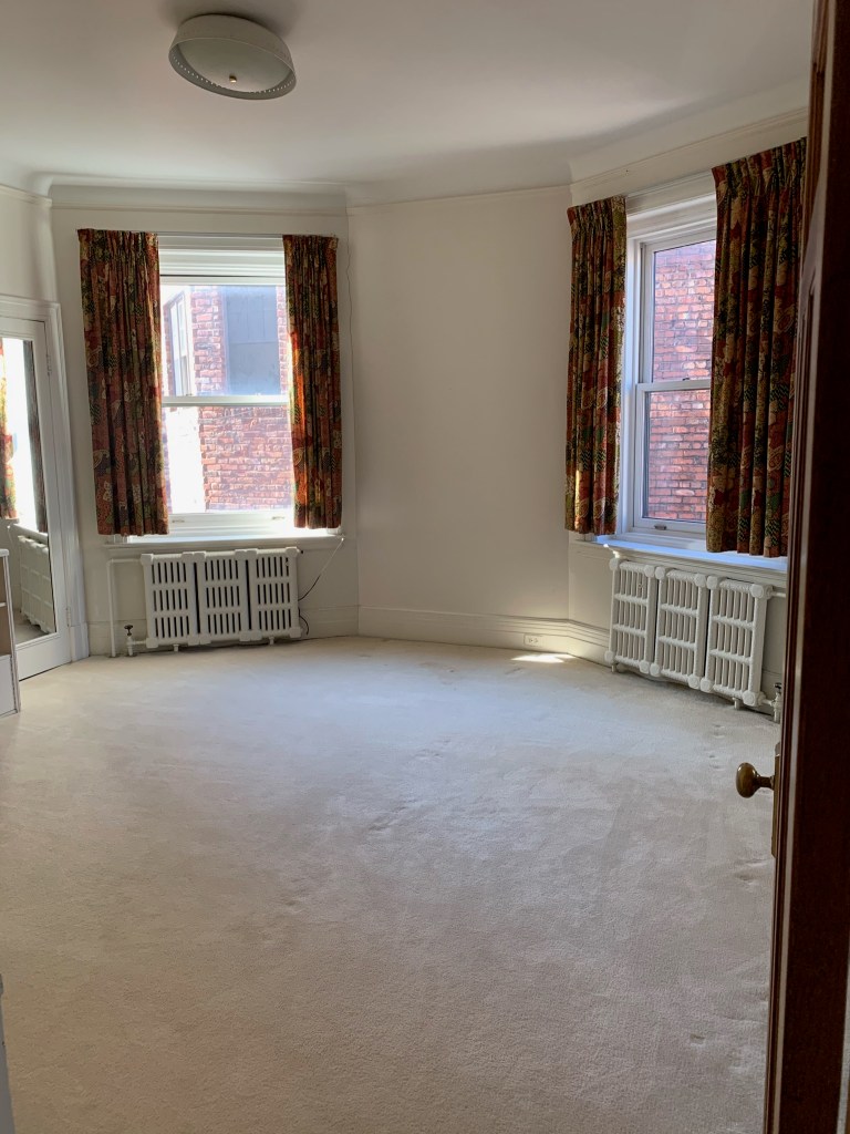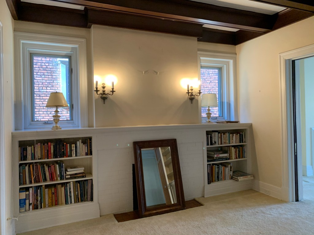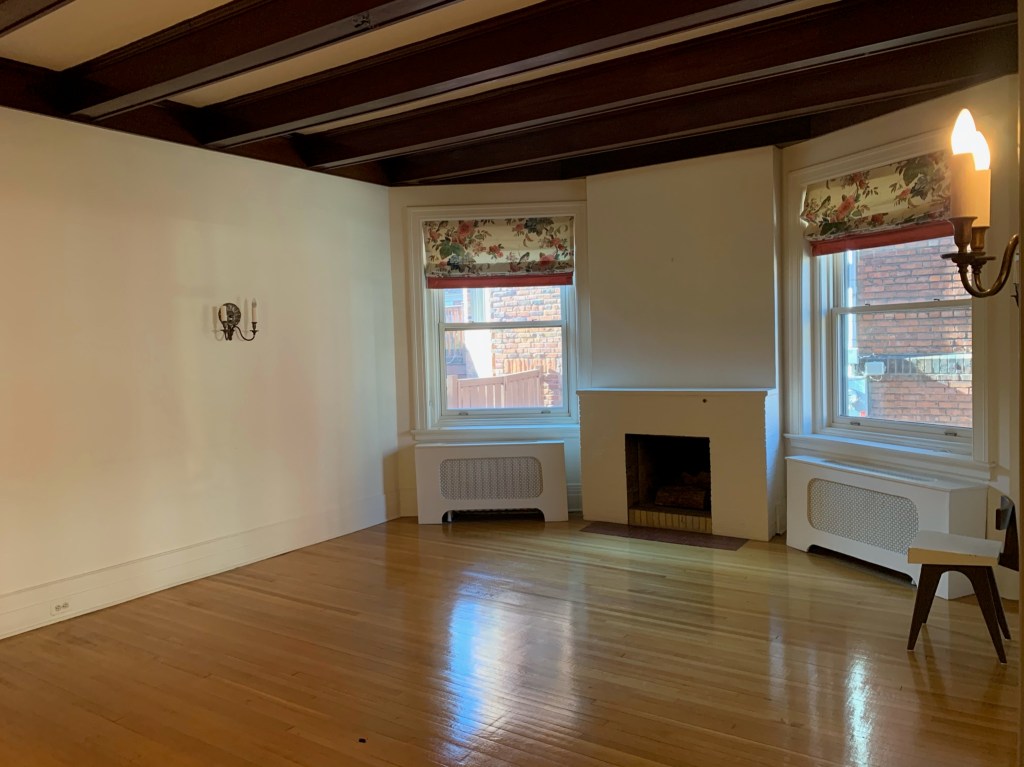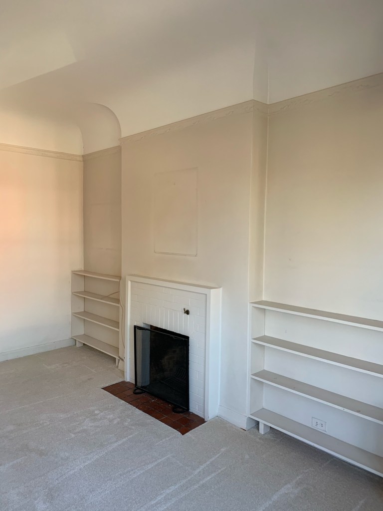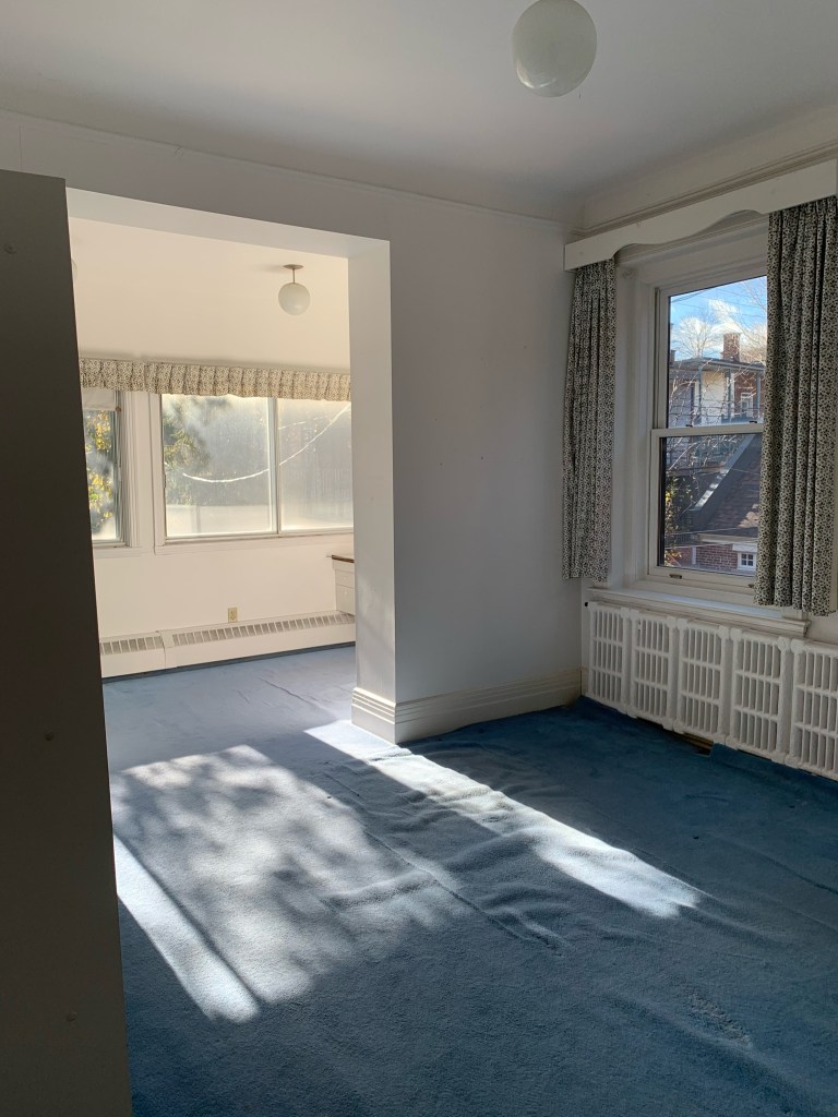 ^ Original living room moldings offer an amazing chance to use 3 colors to intensify the details. Will paint window moldings, and walls too. Carpet removed to reveal original wood floors. Curtains are…. gone ๐