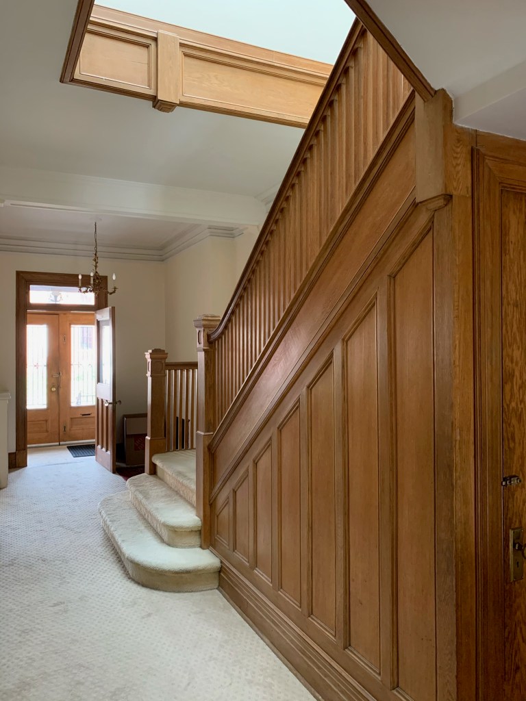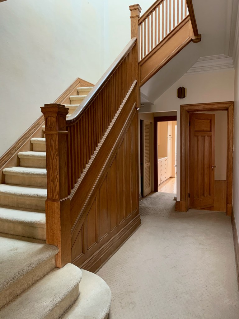 ^ Double-height stairway up to a skylight. Have thought about decorative painting mural of sorts here, possibly on grasscloth.